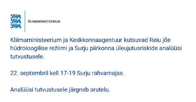 22. septembril kell 17-19 toimub Surju Rahvamajas Kliimaministeeriumi ning Keskkonnaagentuuri korraldatud uuringu tulemuste tutvustamine. Arutlusele tuleb Surju piirkonna üleujutusriskide...