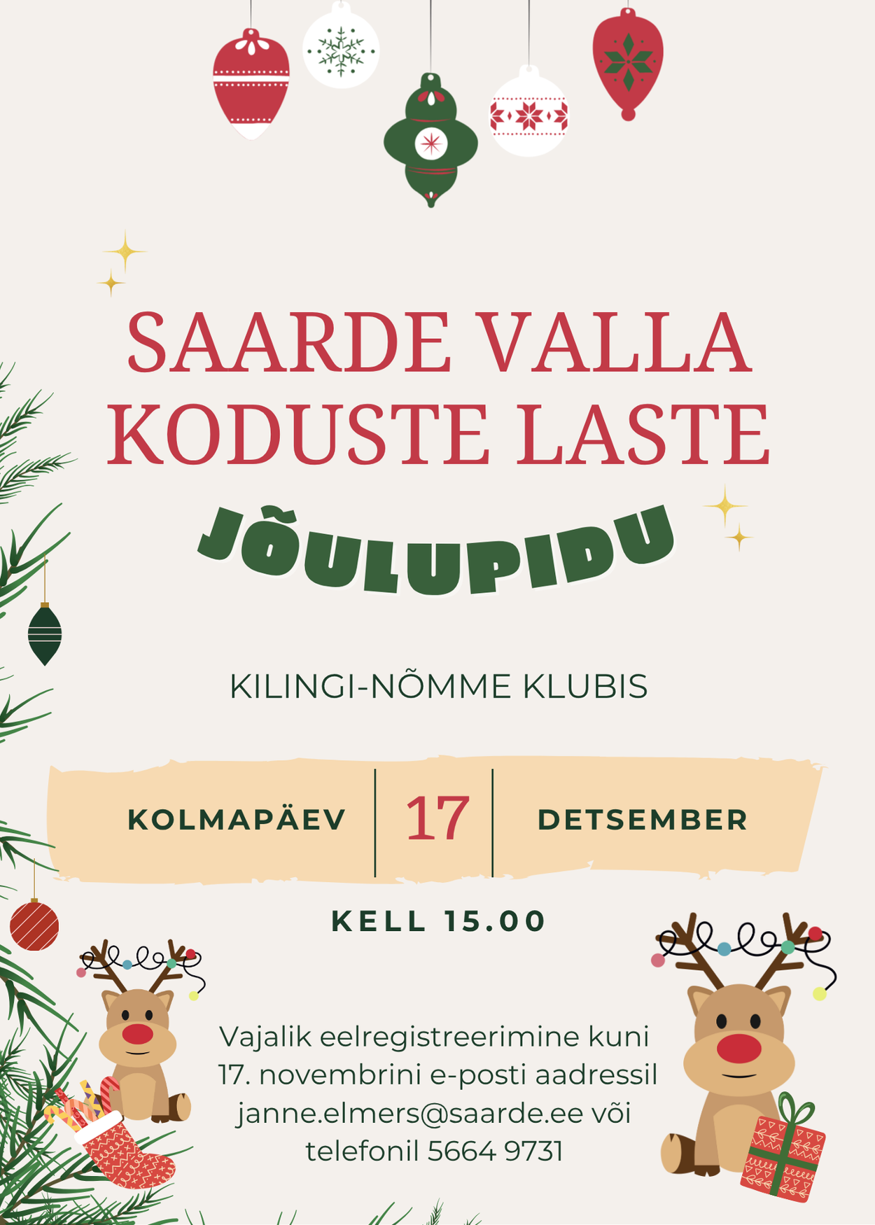 Saarde valla koduste laste jõulupidu toimub 17. detsembril algusega kell 15.00 Kilingi-Nõmme Klubis (Pärnu tn 73, Kilingi-Nõmme).
