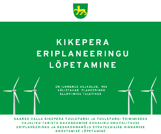 Saarde Vallavolikogu algatas 17.10.2024 otsusega nr 1-3/158 „Saarde valla Kikepera tuulepargi ja tuulepargi toimimiseks vajaliku taristu kavandamise kohaliku omavalitsuse eriplaneeringu ja...