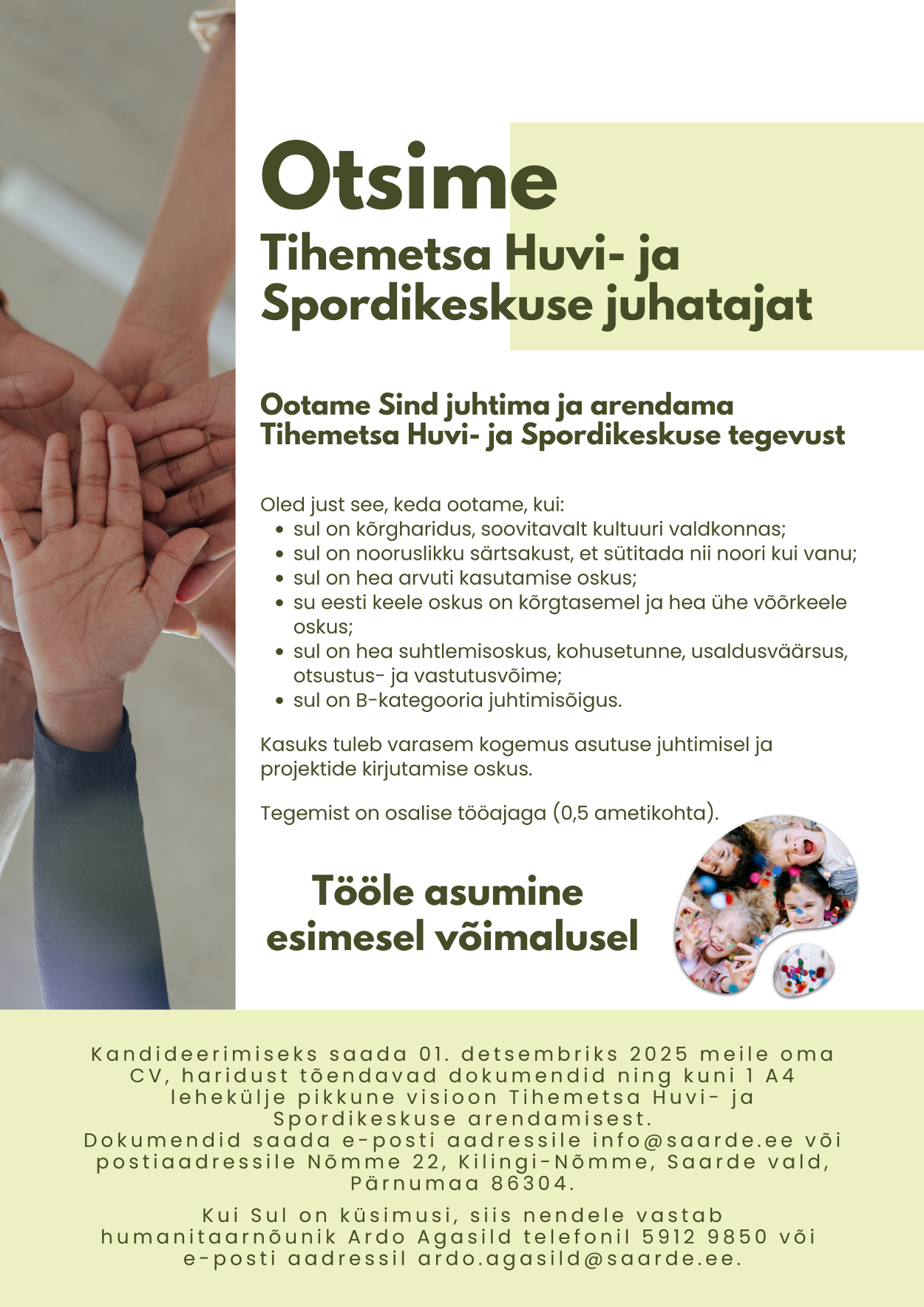 Saarde Vallavalitsus kuulutab välja avaliku konkursi Tihemetsa Huvi- ja Spordikeskuse juhataja leidmiseks.