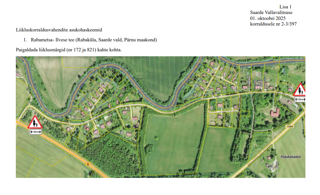 Saarde vallavalitsuse korralduse alusel paigaldatakse Saarde vallas, Rabakülas, Rabametsa- Ilvese teele kaks liiklusmärki (nr 172) koos kahe lisateatetahvliga (nr 821).