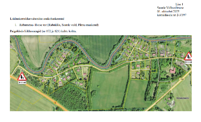 Saarde vallavalitsuse korralduse alusel paigaldatakse Saarde vallas, Rabakülas, Rabametsa- Ilvese teele kaks liiklusmärki (nr 172) koos kahe lisateatetahvliga (nr 821). Pärnu maakonnas,...