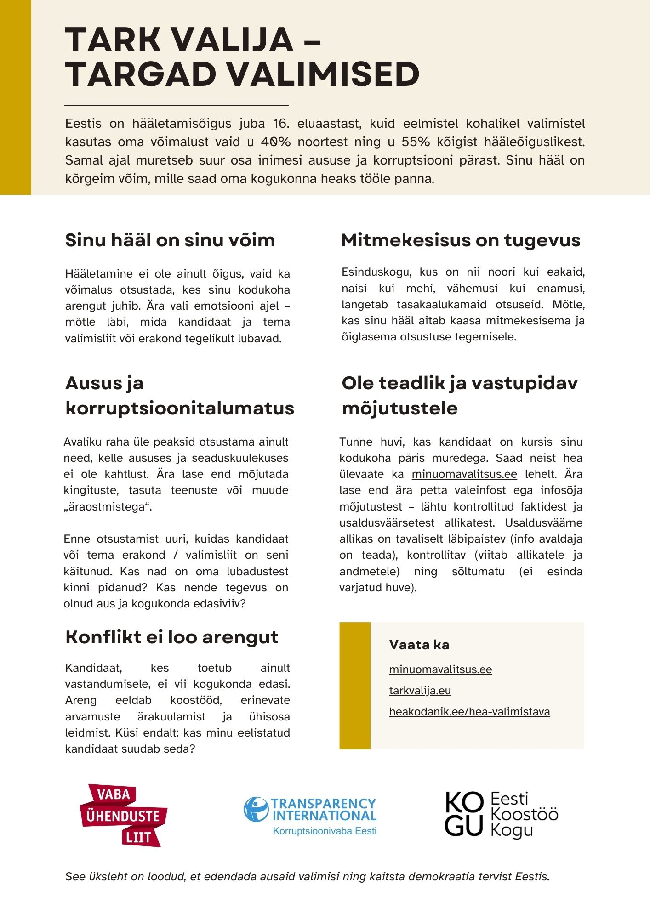 Vabaühenduste Liit , Eesti Koostöö Kogu ja Korruptsioonivaba Eesti on teinud pöördumise: TARK VALIJA – TARGAD VALIMISED Eestis on hääletamisõigus juba alates 16....