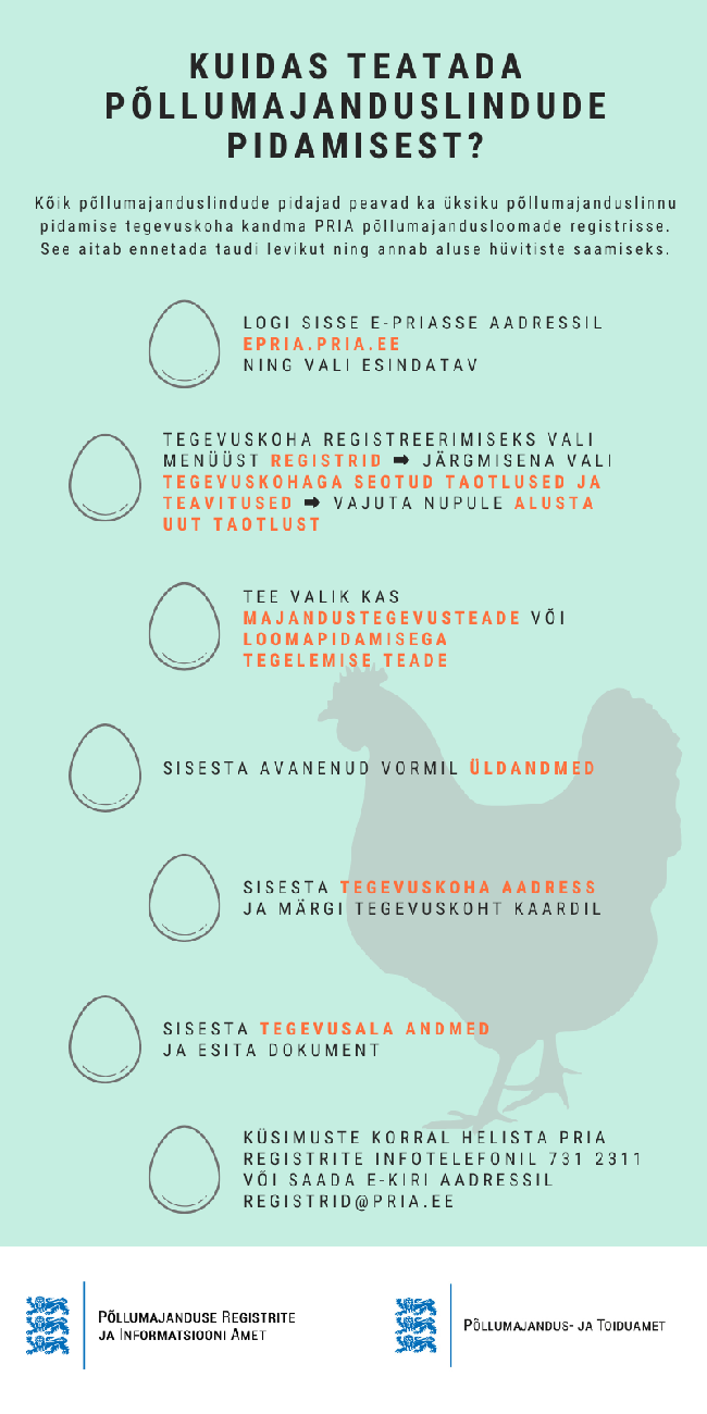Kui Sul on kasvõi üks kana või ükskõik milline teine kodulind, siis ole hea ja mõtle läbi oma linnu haigestumisriskid ning teavita lindude pidamisest PRIA põllumajandusloomade registrit....
