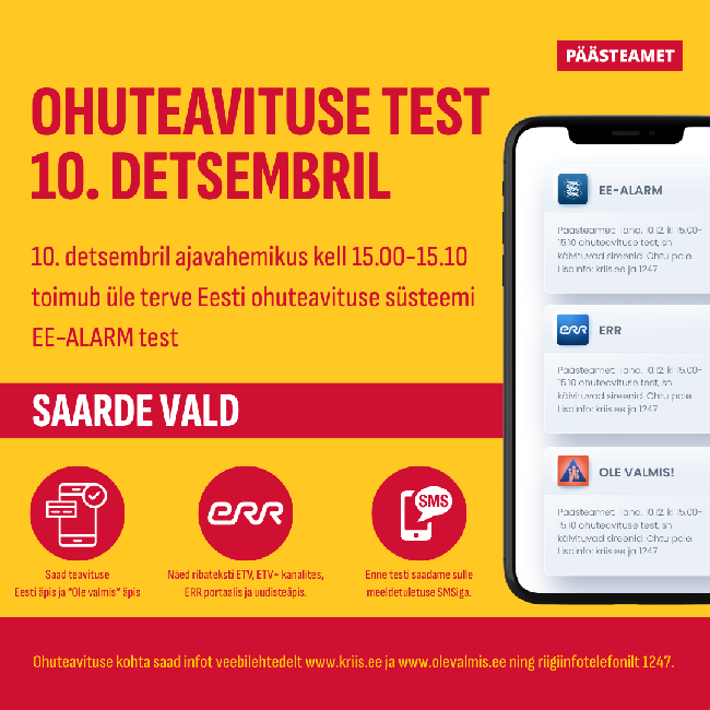 Päästeamet testib kolmapäeval, 10. detsembril EE-ALARM ohuteavituse erinevaid kanaleid, sh käivitatakse sireenid. Tegemist on testiga ja tegelikku ohtu pole. ...