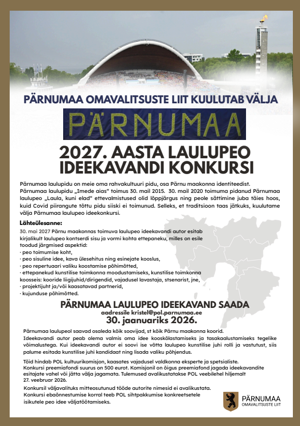 Pärnumaa Omavalitsuste Liit kuulutab välja Pärnumaa 2027. aasta laulupeo ideekonkursi. Ideed esitada hiljemalt 30. jaanuaril 2026 e-posti kristel@pol.parnumaa.ee Ideekonkursi tingimusi...