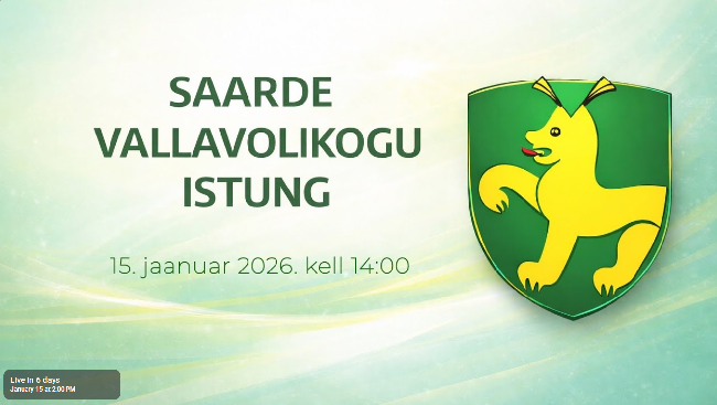 Saarde vallavolikogu istung toimub neljapäeval, 15. jaanuaril 2026 algusega kell 14.00 Kilingi-Nõmme Klubis, aadressil Pärnu tn 73, Kilingi-Nõmme linn, Saarde vald. Kinnitamisele läheb...